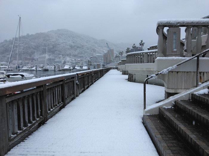 海沿いのデッキにも足を延ばしてみる。床が木製なので、雪で却って滑るではと危惧したのだろうか。誰も足を踏み入れていない、綺麗な新雪のままであった。積もった雪を踏みしめてみる。水分が多いようでしっかり固まるので、滑ることはなかった。