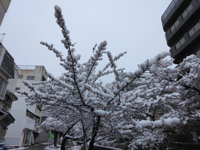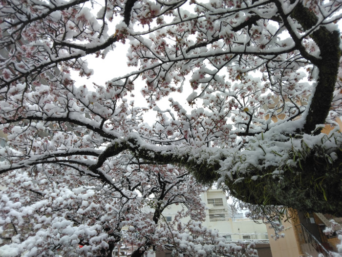 First, I took a look at the Atami cherry blossoms along Itokawa River. There was far more snow piled up on the cherry blossom branches than I had imagined.