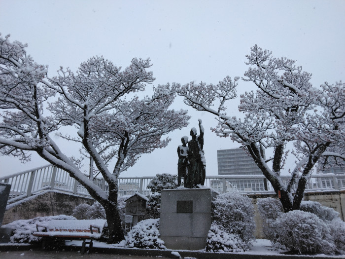 サンビーチの南には、江戸時代に上の汚職に対して正義を貫いた釜鳴屋平七とその妻の像が立っている。それぞれに寄り添うように、二本の熱海桜が佇んでいる。夫婦を、雪の冷たさから庇護しているのだろうか。自ら雪をしっかりと被っていた。