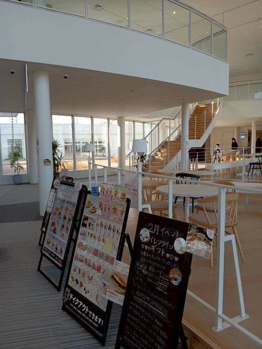 エントランスはとても開放的で、右側にはカフェとラウンジ、左側にはショップがあります。