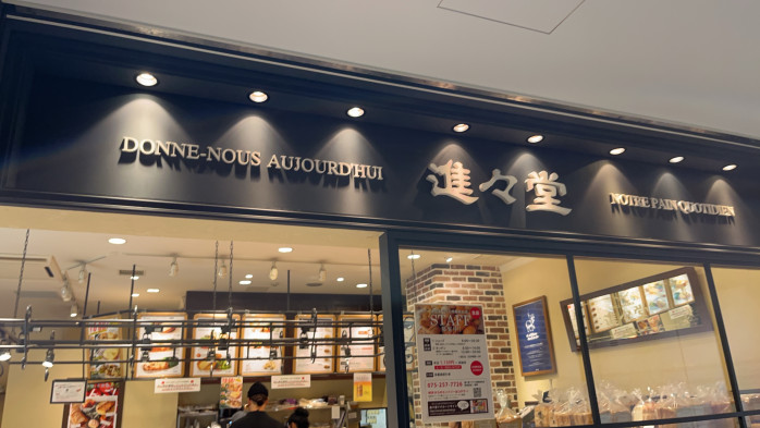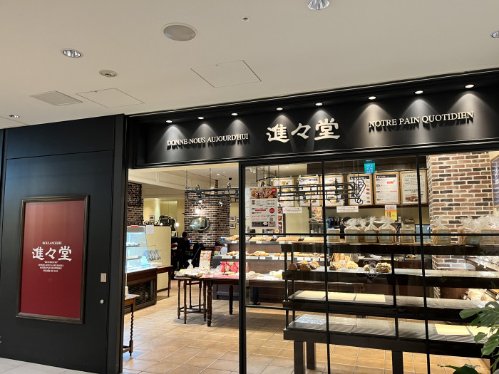地下鉄四条駅、そして阪急烏丸駅から直結の施設「ラクエ」の地下に、パン屋さん「進々堂」の店舗があります。