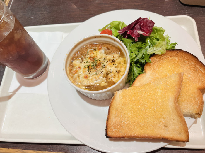 いただいたのは、モーニングの「オニオングラタンスープセット」。