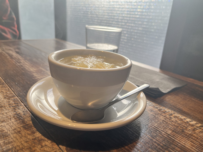 レモンの果肉がたっぷり入った自家製レモネード、やさしい甘さと熱々の温度感がとてもうれしかったです。