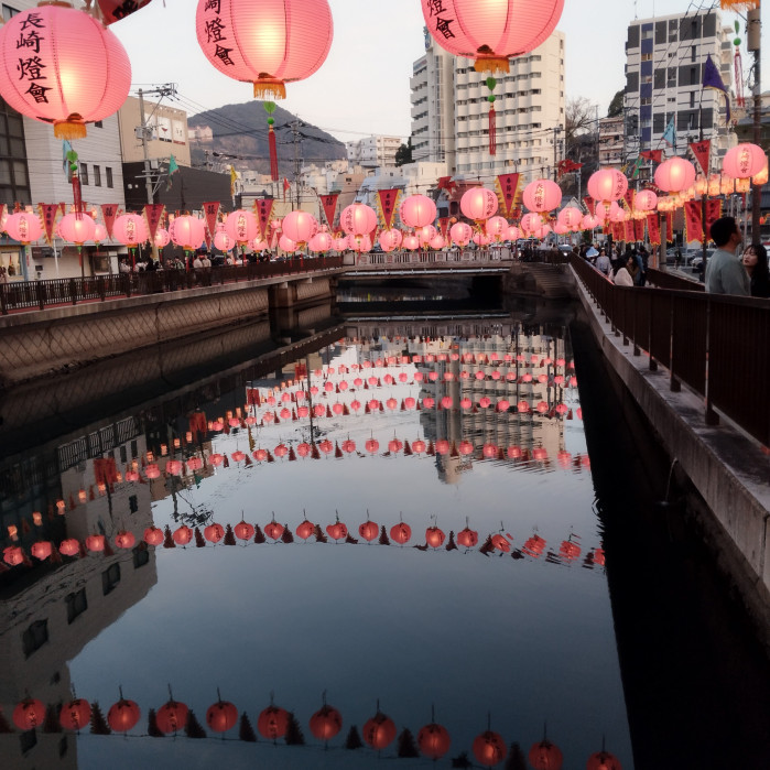 新地橋は銅座川にかかる橋で、橋から見る川には、たくさんのランタンが飾られ、水面に反射したランタンがとても綺麗です。