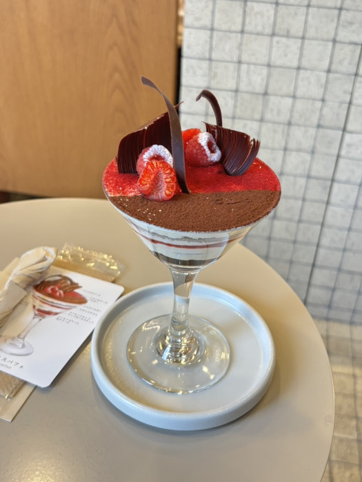 期間限定のティラミスパフェは、大人のためのご褒美デザート。マスカルポーネを贅沢に使った濃厚クリームに、カマンベール×アールグレイのムースを重ねたティラミス仕立て。甘酸っぱいフランボワーズ、ほろ苦いエスプレッソ、ほんのり塩味のムースが層になり、スプーンを入れるたびに味わいが変化します。奥行きのある調和が印象的でした。
