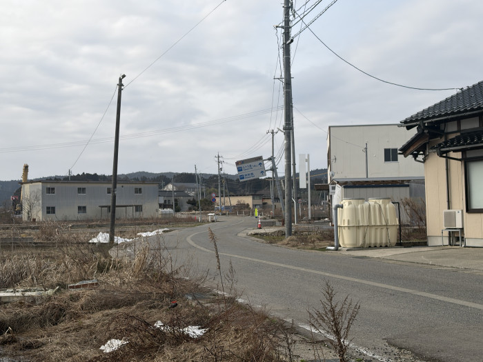 見附島の近くにある宝湯へ向かうと、周囲は驚くほど静かで、かつて家が立ち並んでいた場所は更地になっていました。公費解体が進み、倒壊した家屋はほとんど撤去されています。地震直後の面影をとどめていたのは、わずかに傾いたままの電柱。時間は進んでいるのに、あの日の記憶だけがそこに残っているようでした。