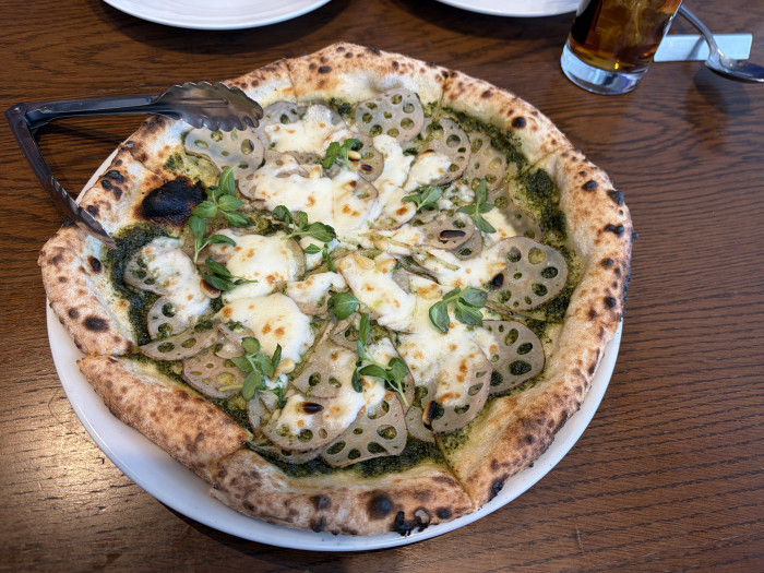 店内に入ると、窯から漂う香ばしい香りが食欲をそそります。まず登場したのは、加賀れんこんを使ったピザ。石川県らしい食材を取り入れた一枚で、シャキッとしたれんこんの食感が心地よく、バジルソースの爽やかな香りと見事に調和しています。生地は外はパリッと、中はもっちり。窯焼きならではの香ばしさが広がり、最後の一切れまで飽きずに楽しめました。