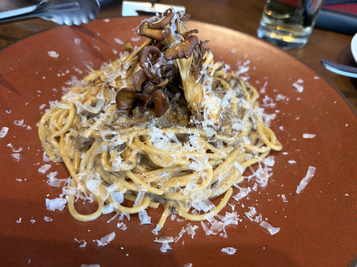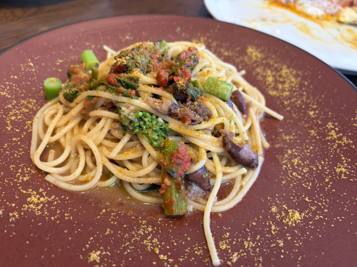 香り高いポルチーニとたけのこを合わせたクリームソーススパゲッティを。濃厚でありながら重たすぎず、ポルチーニの深い旨みとたけのこの食感が心地よいアクセントに。季節感を大切にした一皿です。