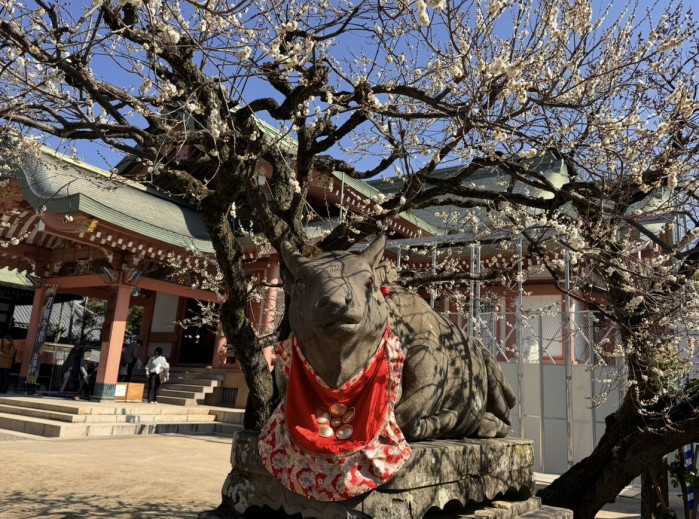 そして入口すぐのお牛様の真上の梅の木もいい頃合いで美しい!