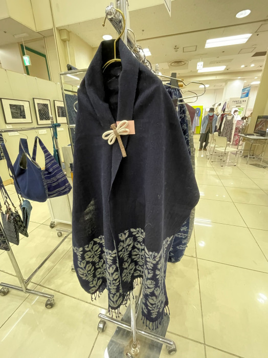 ご自分で仕立てられたそうです。現代的なデザインにも絣がマッチするというお手本ですね。こんなコーディネイトができる大人って魅力的です!