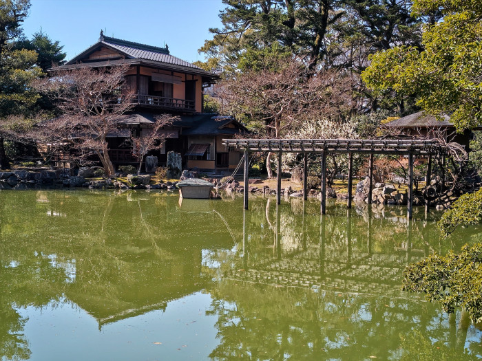 厳島神社からは、趣のある拾翠亭の外観を見ることができます。拾翠亭は通常は非公開ですが、年末年始を除く木・金・土と、5月15日の葵祭、10月22日の時代祭には公開されています。