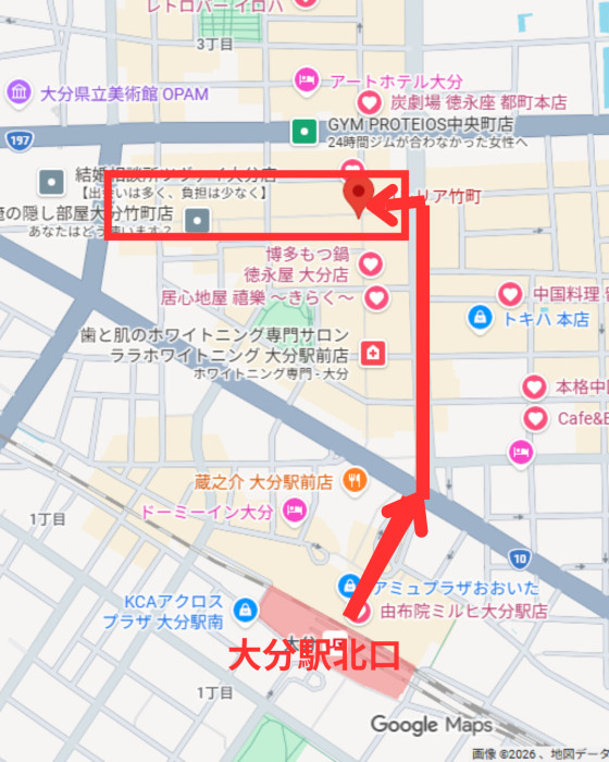 大分駅北口から、以下のマップの通りに行けば商店街入口に入ります。