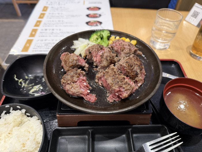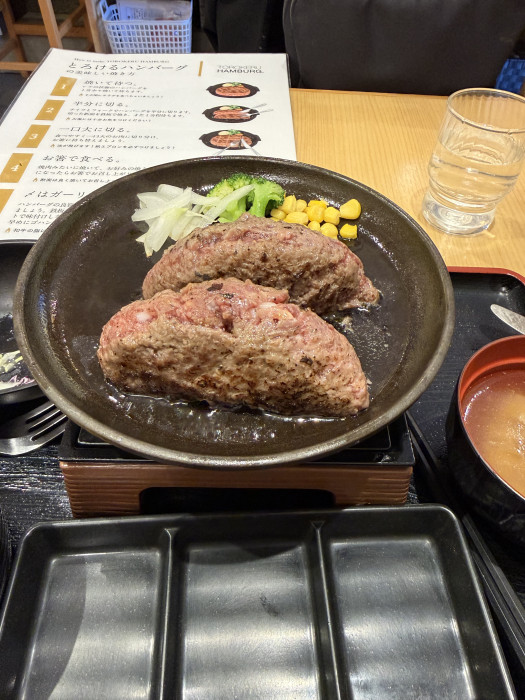 水分と肉汁を多く含んだハンバーグを焼き立てで食べれるのがまず最高でした!焼き加減にもよりますが、箸で崩れない程度の柔らかさまで焼いて食べました。