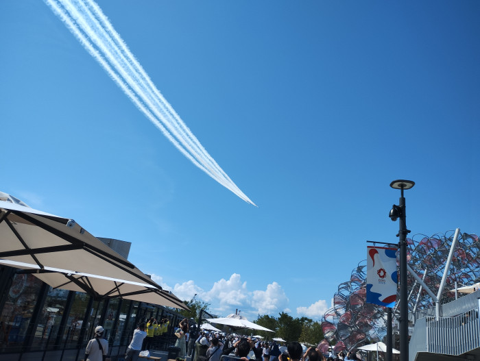 ただ、移動中のバスからバックヤードを見たところ、多くの休憩中のスタッフさんがブルーインパルスを撮影していました。