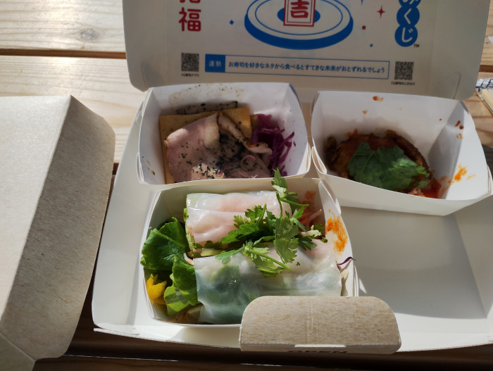 RITE未来の森の見学の後は、万博限定メニューのテイクアウトのため、くら寿司へ。
