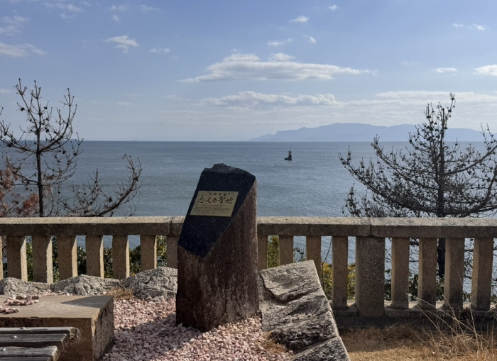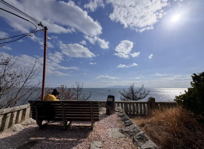 兵庫県赤穂市御崎にある「伊和都比売(いわつひめ)神社」の鳥居のすぐ隣にある「恋人の聖地」通称「一望の席」のベンチ。