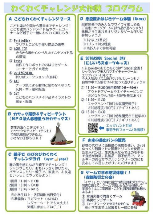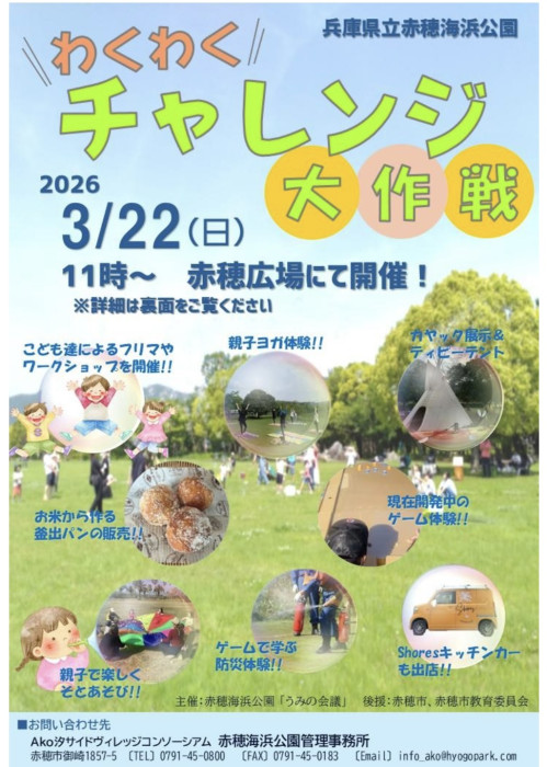 3月の三連休の最終日、3月22日(日)に兵庫県赤穂市にある県立赤穂海浜公園では、親子でわくわくするチャレンジができるイベントが開催されます。