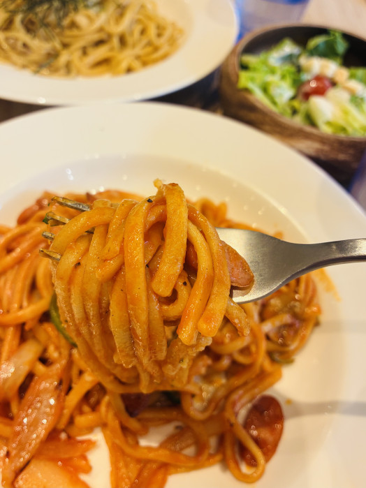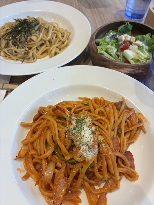 パスタにサラダ。このセット感、ランチタイムのワクワクが詰まってます。