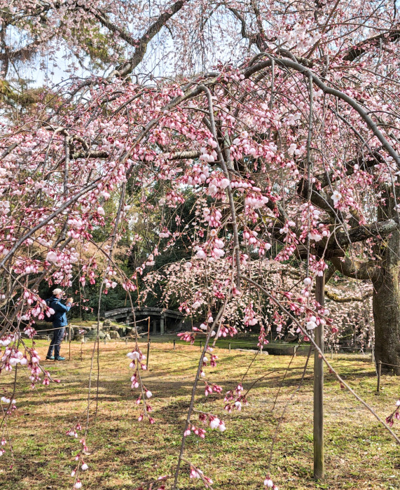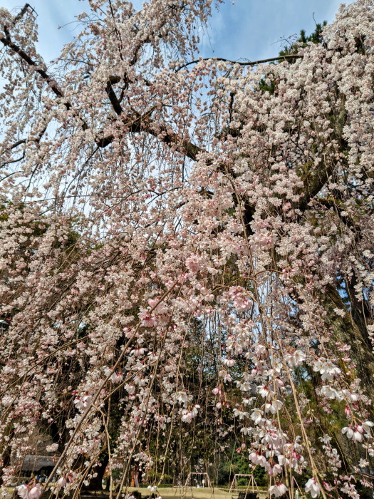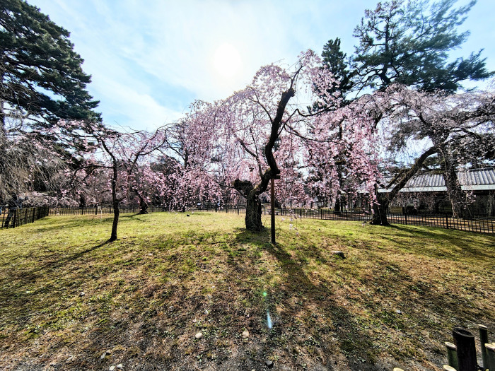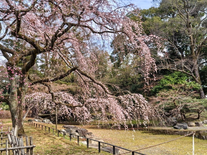 でも春の花の代表的な存在といえばやっぱり桜。京都御苑内の桜の名所は近衛邸跡と出水のしだれ桜です。