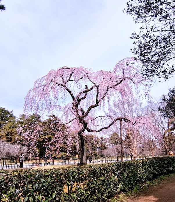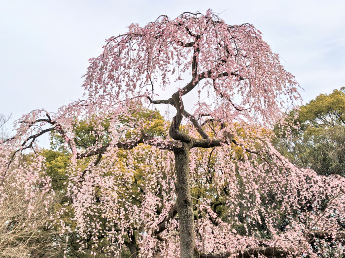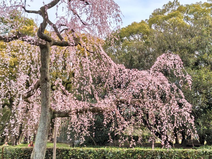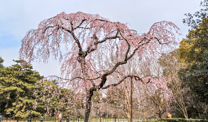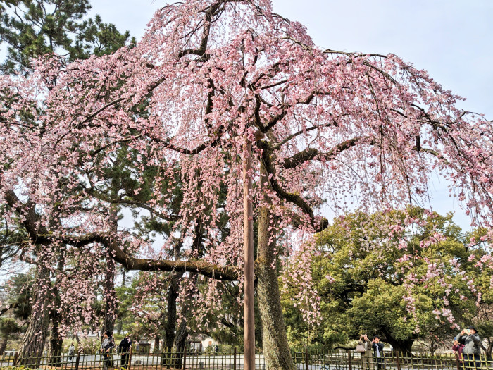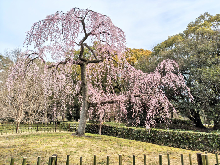糸桜とも言われる美しくて繊細なしだれ桜で、京都御苑の中では早咲きの方です。