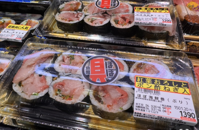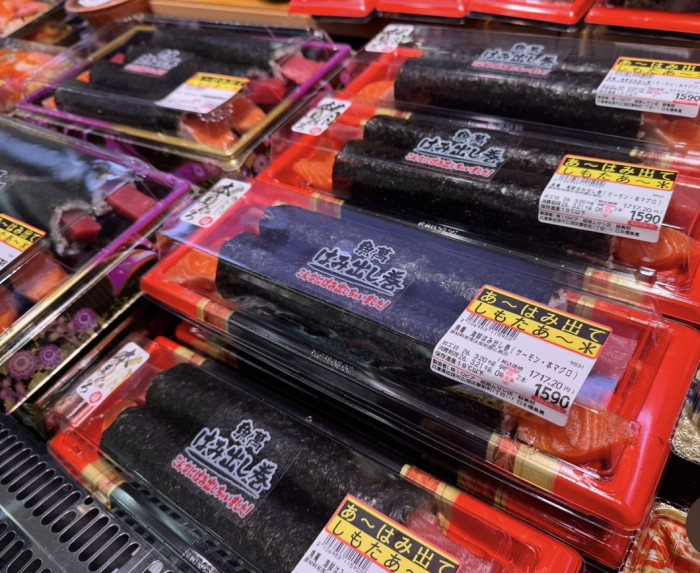 ロピアの魅力はオリジナル商品にあり。すべての商品がダイナミックでネタがはみ出しすぎの巻きずしなど、これ裏で作ってる人楽しいだろうなあ~って思っちゃいます。