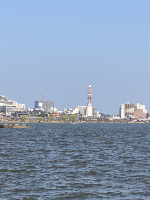 また、湖畔からは水戸の街並みも一望できます。ただこの日は風がやや強く、まだ冷たさも感じる気候。購入したおにぎりはここでは食べず、湖畔を半周ほど歩いてから水戸駅へ戻りました。