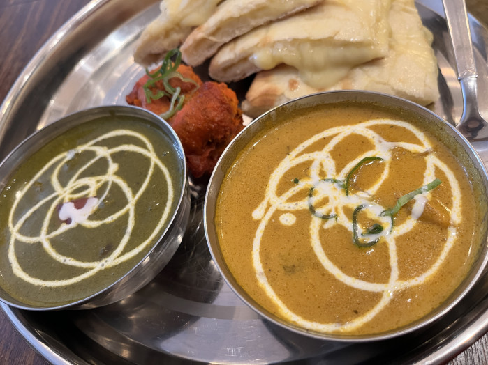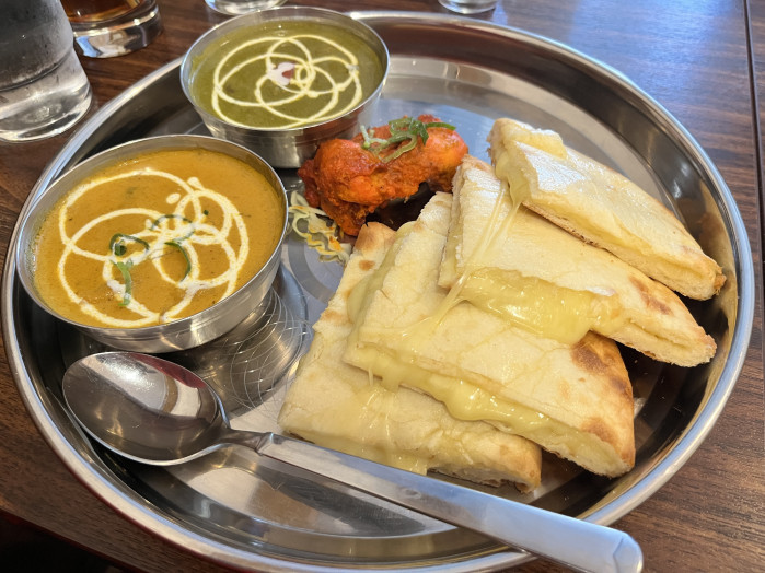 たっぷりのチーズがとろける甘いチーズナン、日替わりのほうれん草のカレーと、バターチキンカレー。