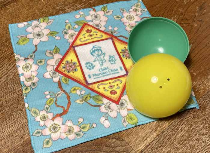 写実的な桜と、素朴なまるちゃんとの対比がオシャレなタオルハンカチ!