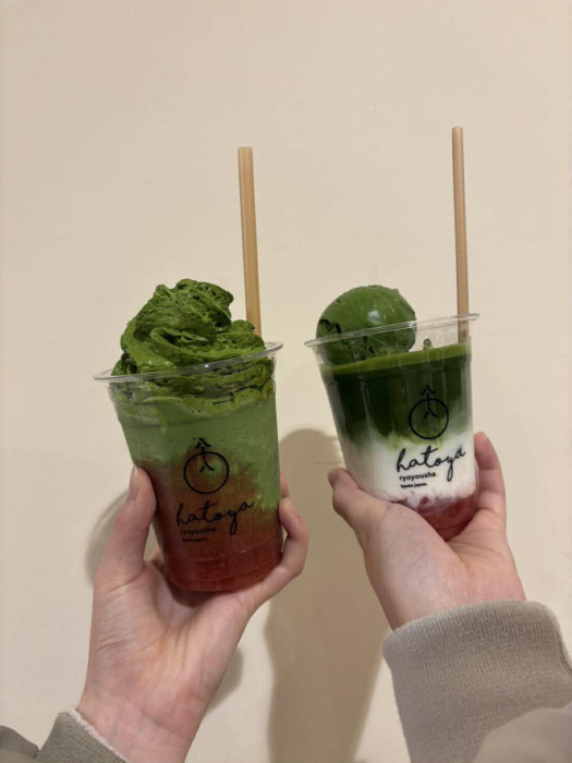 右が抹茶ラテにアイスを重ねた“飲むパフェ”。左がソフトクリームに濃厚な抹茶を振りかけてあり、抹茶の苦みと、いちごの甘酸っぱさが層になっていて、混ぜながら味の変化を楽しめるのが特徴です。見た目のインパクトだけでなく、しっかりと抹茶の風味が立っているのも、このお店ならでは。