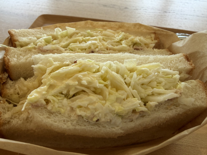 イートインスペースも広々しています。朝の時間は、サンドイッチを提供しているので、限定の春キャベツのサンド~ツナマヨ~をいただきました。