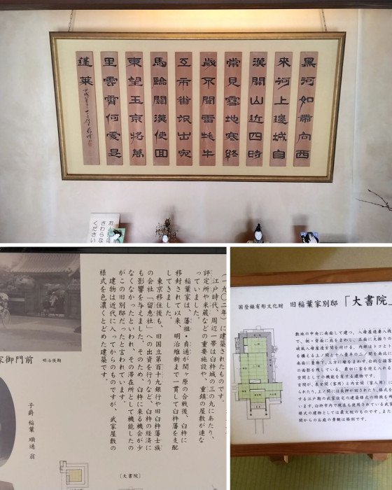 旧藩主のこのお屋敷は、「数寄屋造り」という和式の有名な建築物だそうです。関ヶ原の戦いで活躍した稲葉氏が、江戸時代になって臼杵藩を与えられ、美濃(岐阜県)から移動したそうです。