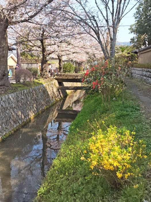 京都の地形は北から南へゆるく傾斜していて、市内を流れる鴨川・桂川・白川や琵琶湖疎水の水も北から南へ流れているのですが、ここ哲学の道沿いに流れる疎水だけは人工的な傾斜により南から北へと流れています。