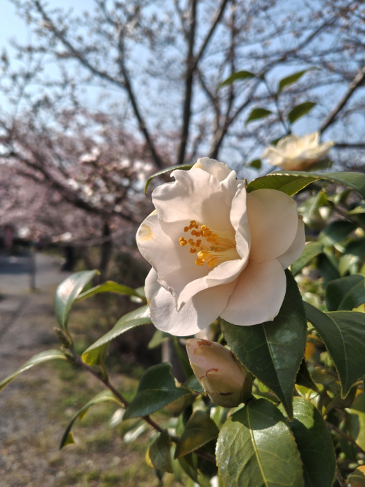 この時期の哲学の道には、椿などほかの花も咲いています。