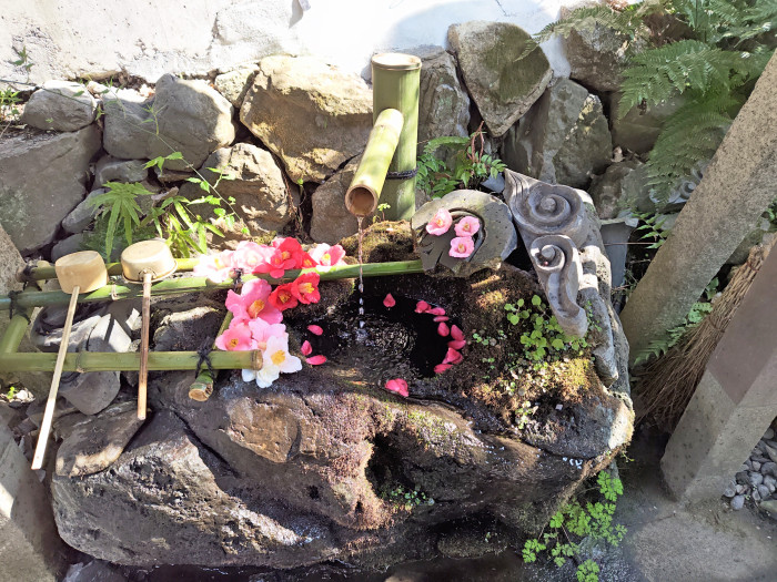 椿の名所でもある大豊神社の手水鉢には鮮やかな椿。