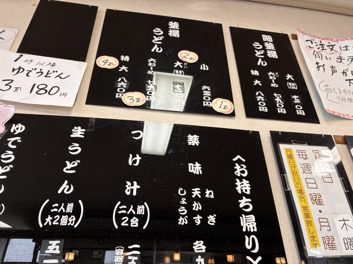 メニュー、釜揚げうどんのみ。夏にはざるうどんもあるみたいですが、基本的には、麺の量と太さを選ぶだけでシンプルで分かりやすいです。
