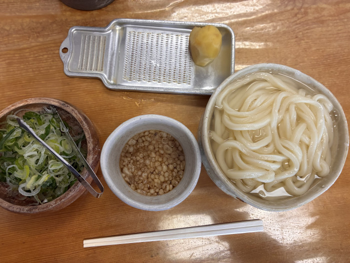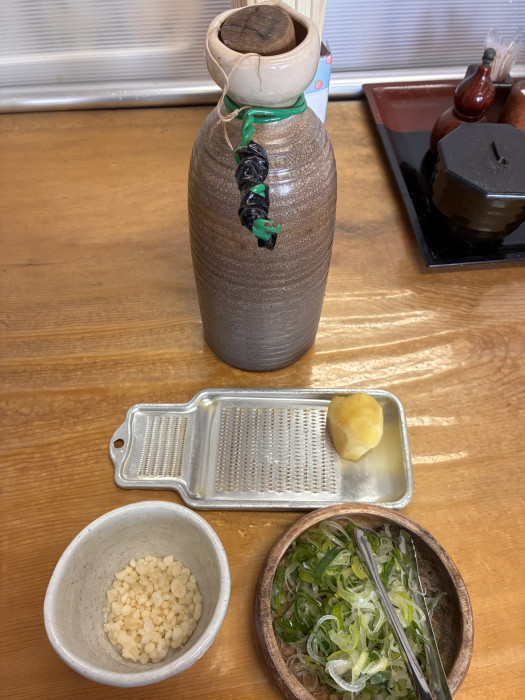 つゆはお出汁がしっかりきいており、特大の徳利に入って自分で注ぐスタイルです。たっぷりの生姜も自分で下ろします。ネギも充分な量が運ばれてきます。天かすはテーブルに据え置きなのでお好みで。
