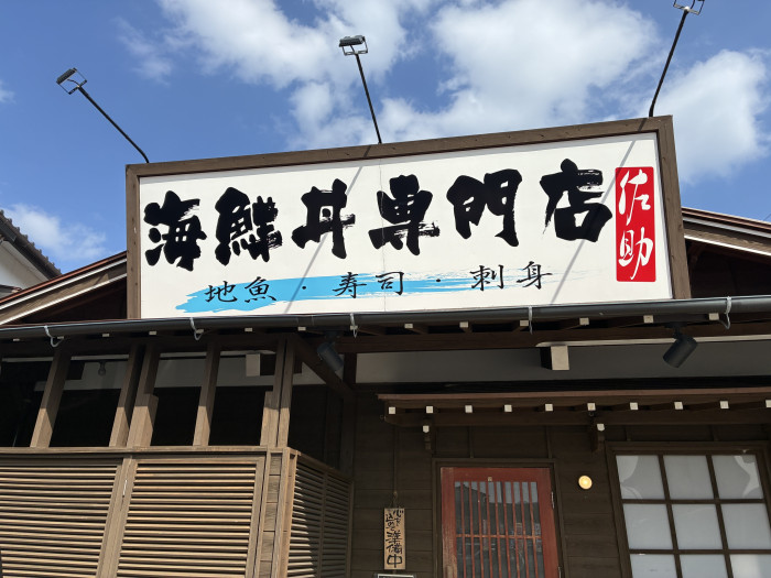 “海鮮丼専門店”!なんともたくましく、心強い看板。店名は「佐助」です。市役所などと近く、コンパクトながらわかりやすい場所にあります。お店の前に4台分のスペースがあり、そちらに駐車。