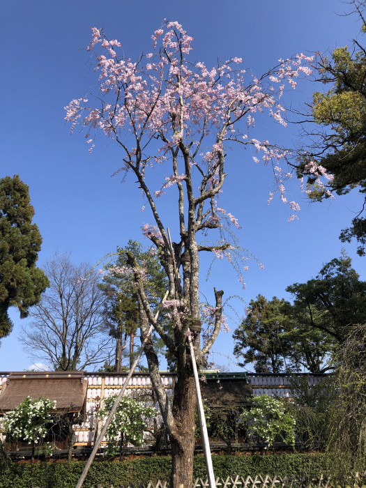 高見の郷は、奈良県吉野郡にある桜の名所。龍の形をした雲が降臨した場所と伝わり、「龍神桜」は、そこに植えられたしだれ桜に付けられた名前です。その桜の一つが、北野天満宮に奉納されたわけですね。