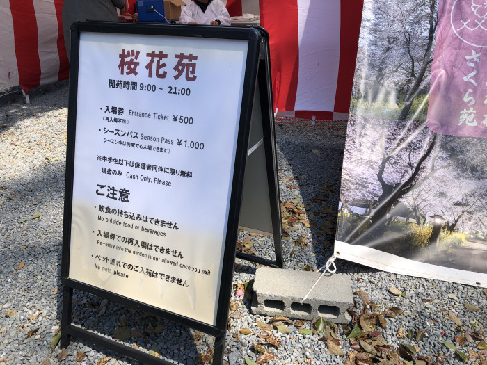 入場料は500円。中学生以下は保護者同伴で無料とのこと。1,000円で期間中何度でも入場できるという、シーズンパスもありました。開苑時間は9時から21時までで、夜桜のライトアップも楽しめます。