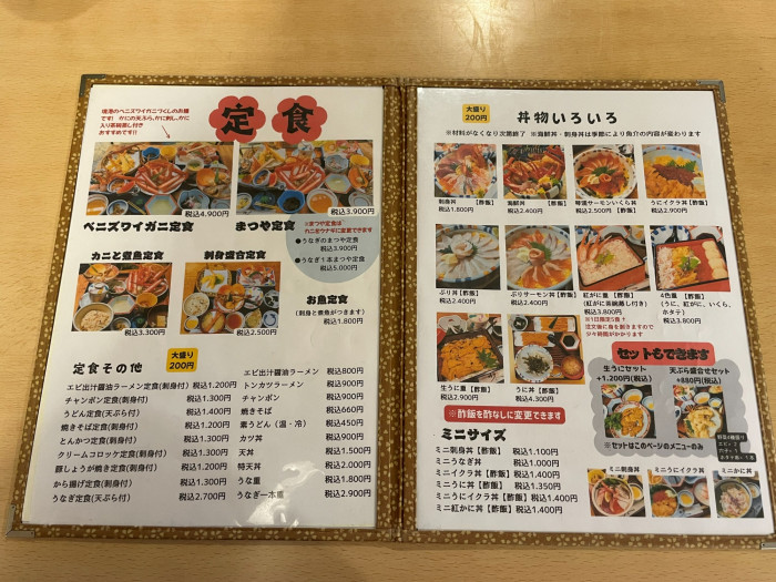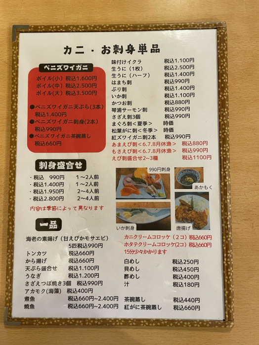 お聞きすると、もうずいぶん前に旅館は閉業されて、食事処&お土産店(カニがメイン)としてのみ経営されているそうです。それで店内も食事専用にリニューアルされたんですね。
