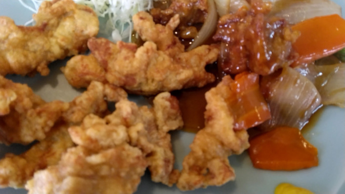 メニューは多岐に渡りますが、定食が一番のおすすめです。ご飯は大盛りにしました。すると…