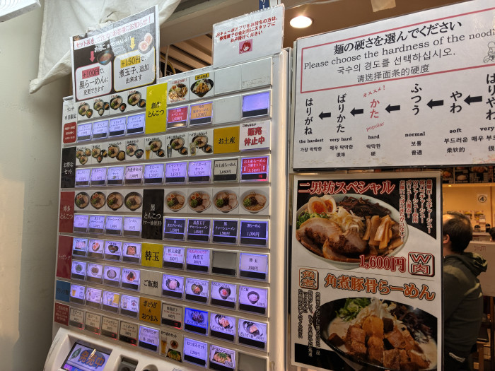 食券で事前精算です。麺の硬さは6段階!オススメは「かた」とのこと。サイドやセットメニューも充実しています。