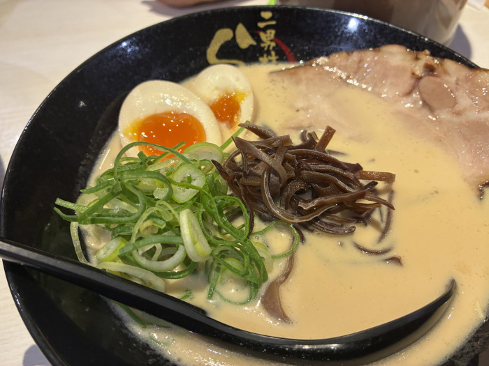 「煮卵ラーメン」(1,050円)。底が見えないほど、白濁した濃厚そうなスープ!すすると想像通り、ぐっとコクを感じます。でも後に残りがちな臭みがない。というのも二男坊は、「男性も女性も楽しめる」というのをコンセプトにしているそうで、臭みや匂いが気になる豚骨ラーメンの凝り固まったイメージを変えたいという思いがあるんだとか。博多ラーメンでありながら、そんな新しさも追及しています。