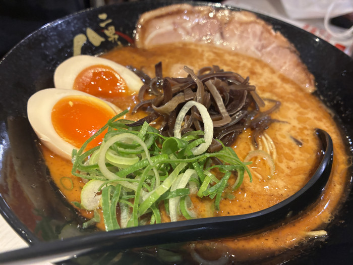 「黒 煮卵ラーメン」(1,150円)。色としては、黒というより赤褐色のような感じ。マー油がブレンドされた、アクセントの効いたスープです。そして博多ラーメンということで、極細のストレート麺!これがまた美味しいんですよね~。ストレートということもあり「かた」がオススメだそうですが、筆者はいつも「ばりかた」一択です。