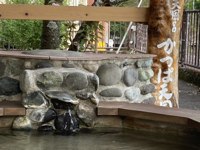 露天の広々とした岩風呂には河童像が座っていて、風情たっぷりです。