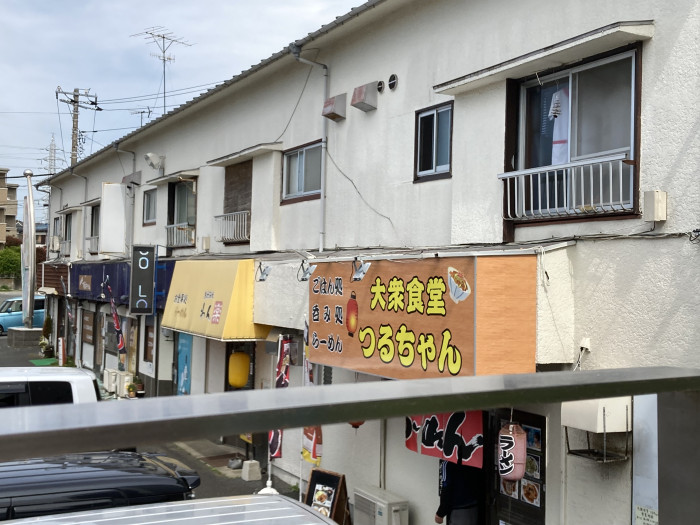 駐車場に面した飲食街にはラーメン、居酒屋、カフェなどあり。