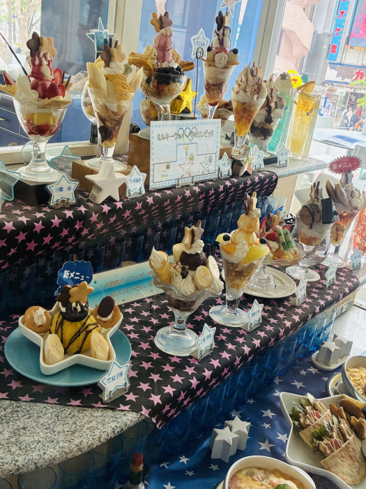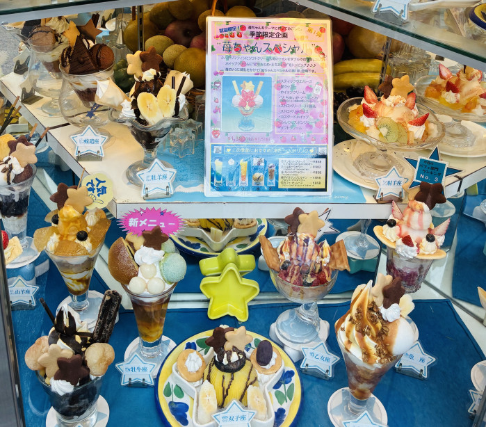 お店の入り口では、星座をモチーフにしたパフェたちがズラリとお出迎え。星型のクッキーやトッピングが散りばめられたディスプレイは、まるでお菓子の宇宙のようです。