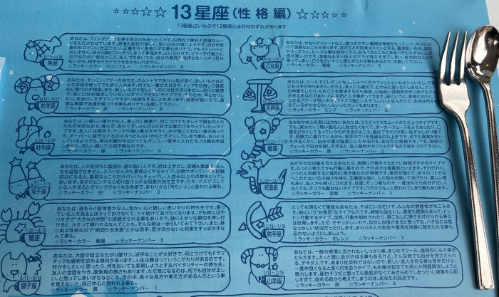 テーブルに敷かれたブルーのマットには、13星座占いがびっしり。自分の運勢をチェックしながらパフェを待つのが、ミルキーウェイ流の楽しみ方です。