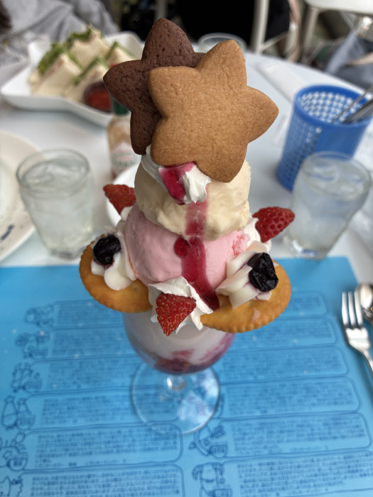 頂点に飾られた2色の星型クッキーがとってもキュート!甘酸っぱい苺と冷たいアイス、そしてサクサクのクッキー。食感の楽しさも満点の一皿でした。