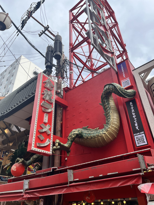 真っ赤な店構えと舞い踊る龍のモチーフが印象的な、大阪・道頓堀のラーメン店「金龍ラーメン」。